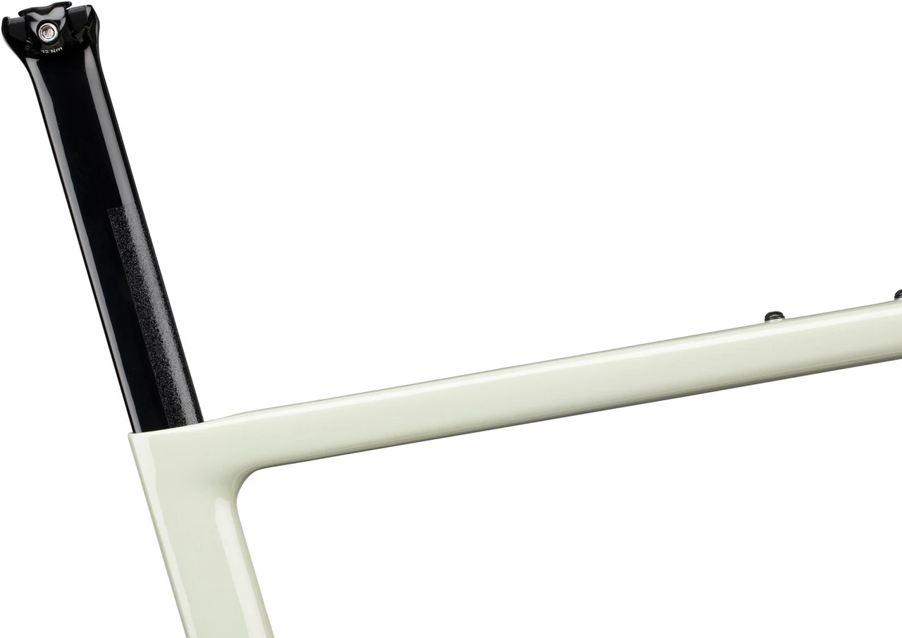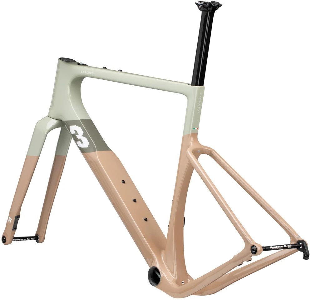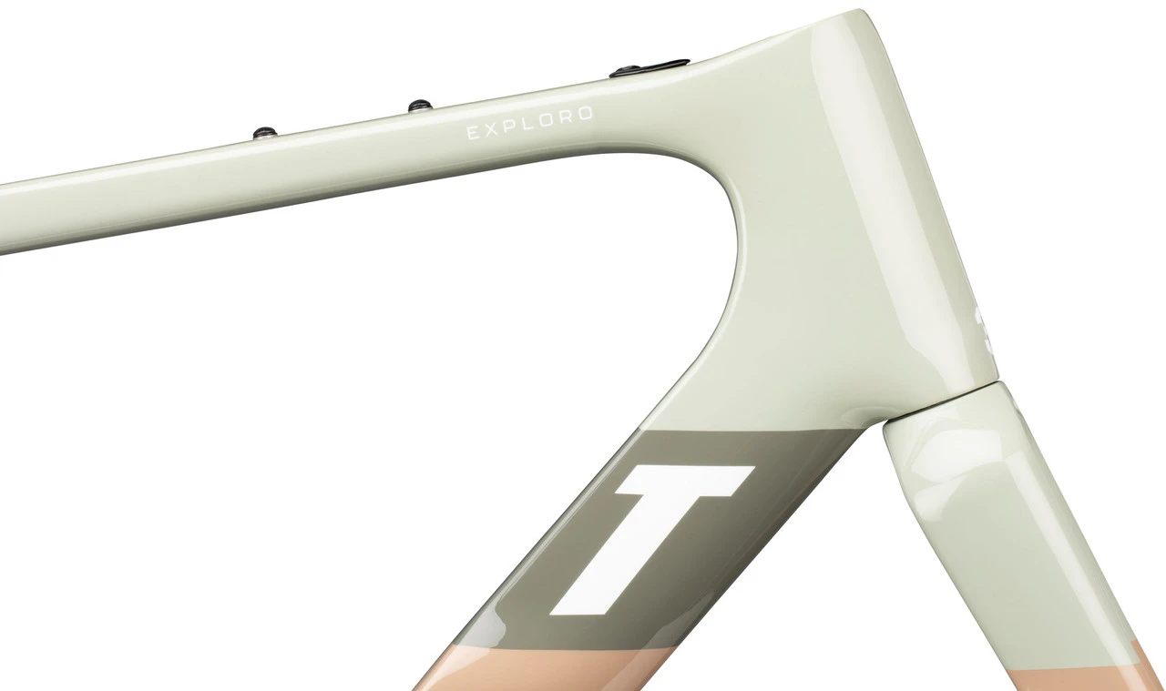 Das Exploro RaceMax Rahmenkit von 3T ist die Basis für ein Gravel-Bike aus Carbon. Je nach Ausstattung kannst Du Dir ein schnelles All-Road-Bike oder eine Gravel-Maschine mit richtig breiten Reifen aufbauen. Der aerodynamische Rahmen, verfügt über ein besonders starkes Unterrohr und ein sehr schmales Steuerrohr. In diesem Steuerrohr befindet sich jedoch ein 1,5″ starker Gabelschaft, der dem Bike Laufruhe und Stabilität verleiht. Wichtig ist außerdem genügend Reifenfreiheit. An der Gabel wird sie unter anderem durch eine minimalistische Gabelkrone realisiert. Der Rahmen selbst hat beidseitig abgesenkte Kettenstreben, wodurch auch dort eine größere Reifenfreiheit realisiert werden kann.