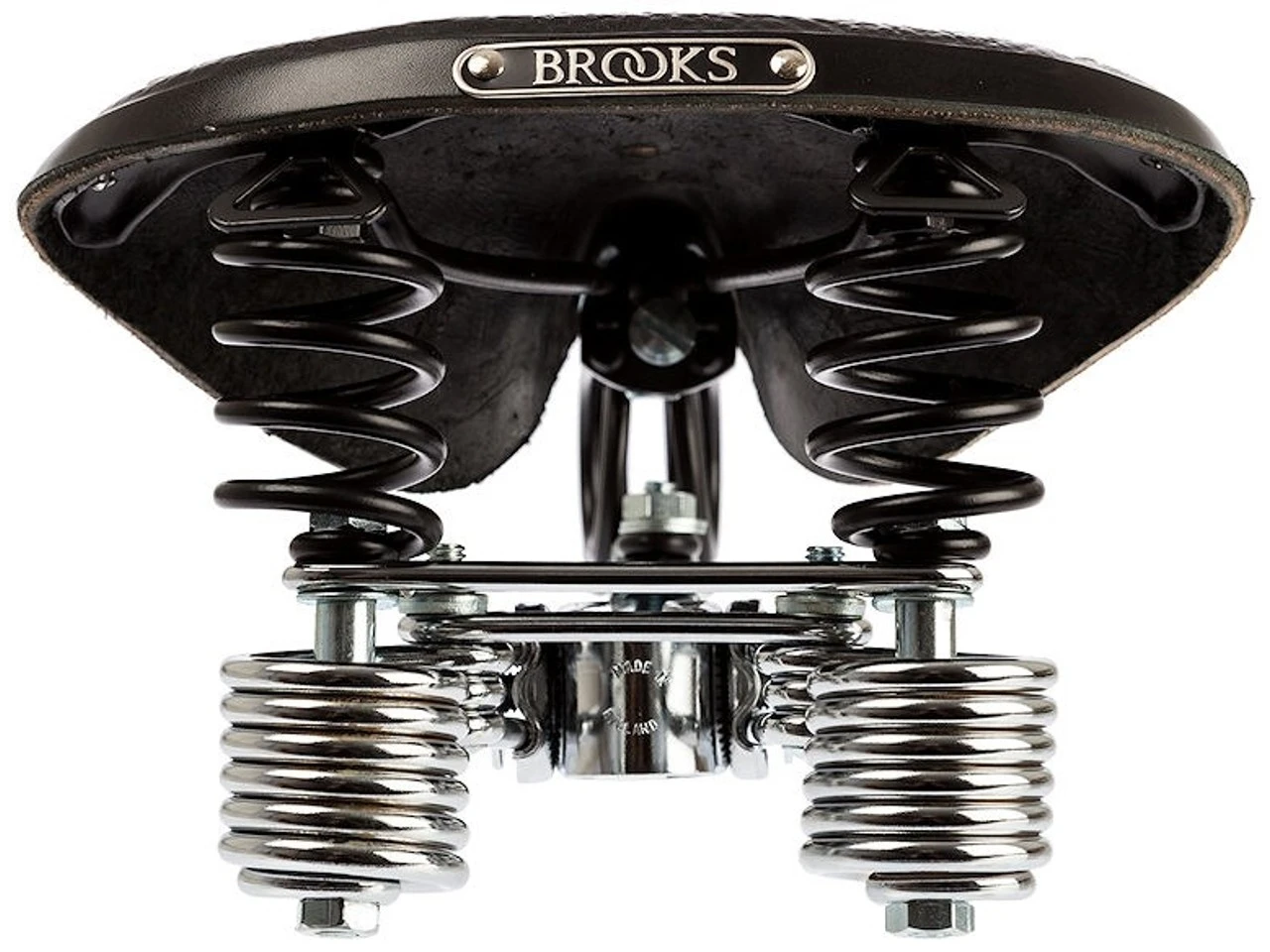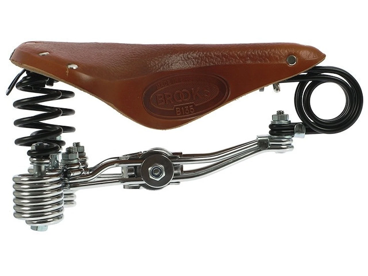 Der B135 Sattel ist einer der am stärksten gefederten Modelle. Er besitzt hinten doppelte Schraubenfedern und vorne eine doppelte Schleifenfeder. Brooks qualitativ hochwertiges Leder sorgt auf der Sitzfläche für den gewohnten Komfort. Die Proportionen entsprechen denen des bewährten B66.