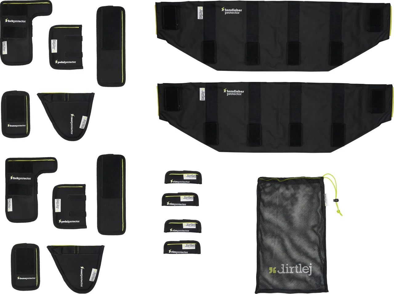 2 x Gabelschutz dirtlej2 x Hinterbauschutz dirtlej2 x Rahmenschutz dirtlej kurz2 x Rahmenschutz dirtlej lang2 x Pedalschutz dirtlej4 x Felgenschutz dirtlej2 x Lenkerschutz dirtlej1 x Netztasche