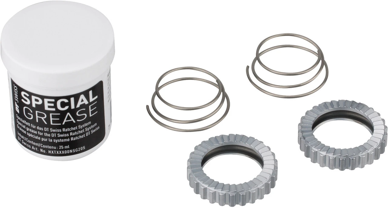 Lieferumfang:2 x Zahnscheibe DT Swiss2 x Feder DT Swiss1 x 25 ml Spezialfett DT Swiss für Ratchet System
