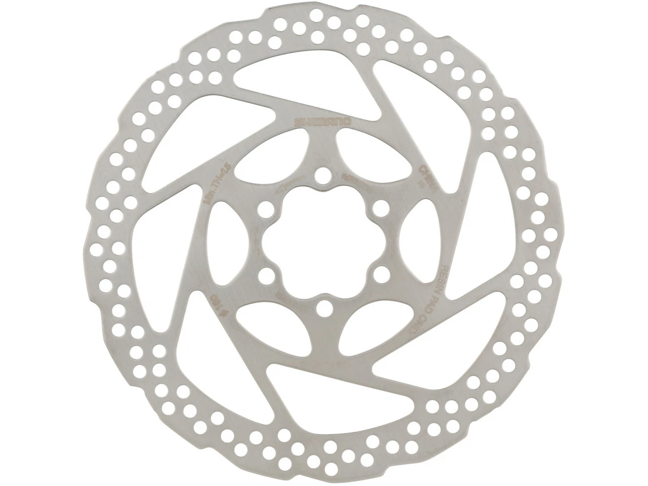 Die Shimano SM-RT56 6-Loch-Bremsscheibe besteht aus einteilig geformtem Edelstahl, der zusätzlich wärmebehandelt und poliert wurde. Sie ist in 160 mm und 180 mm Durchmesser erhältlich und kann für XTR, XT, SLX, Deore und viele weitere Bremsen aus dem MTB-, Trekking- und City-Bereich eingesetzt werden. Beachte dass SM-RT56 nur mit organischen Bremsbelägen kompatibel ist.