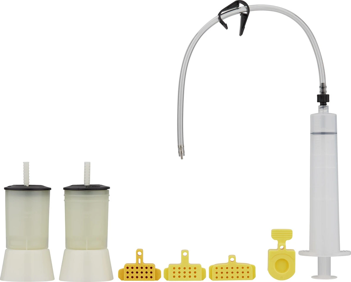 Das Profi-Entlüftungskit TL-BR enthält alle nötigen Teile für eine sachgemäße Entlüftung von hydraulischen Shimano Scheibenbremssystemen, sowohl für den Bremssattel als auch für die Bremsgriffe. Es umfasst die Entlüftungsspritze TL-BR001, die über den mitgelieferten Schlauch und eine Klemme sicher mit dem Entlüftungsnippel bzw. dem Entlüftungssockel am Bremssattel verbunden wird. Außerdem dabei ist der Öltrichter TL-BR003 für Bremsgriffe mit M5-Anschluss, wie sie hauptsächlich im MTB- und Trekking-Bereich vorkommen. Für Rennrad-Schalt-/Bremsgriffe mit M7-Anschluss ist der Trichter TL-BR002 Teil des Lieferumfangs. Du erhältst darüber hinaus vier Entlüftungsblöcke, die mit verschiedenen 2-Kolben- und 4-Kolben-Modellen kompatibel sind und nach Entnahme der Bremsbeläge als Distanzhalter dienen. Lediglich Mineralöl wird nicht mitgeliefert.