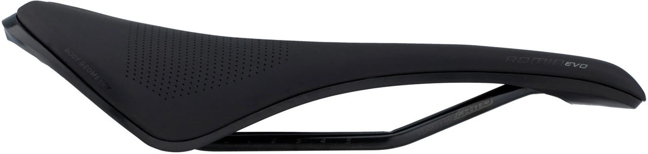 Der Specialized Romin EVO Comp ist ein schmal zulaufender Sattel mit einem robusten Edelstahl-Gestell, der für eine aerodynamische, sportliche Sitzhaltung konzipiert wurde. Dabei sorgen das durchblutungsfördernde Body Geometry Design mit langgezogener Aussparung und Geleinlagen dafür, dass auch der Komfort nicht zu kurz kommt. Die Polsterung aus mittelfestem PU-Schaumstoff ist so gewählt, dass sich eine optimale Balance zwischen Dämpfung und Feedback ergibt, die langstreckentauglich ist. Das wasserabweisende Micromatrix™-Obermaterial steht genauso für Langlebigkeit wie die carbonfaserverstärkte Sattelschale. Dort befinden sich zwei Gewinde, die das Anbringen von Specialized SWAT™-Zubehör erlauben.