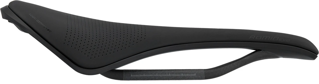Der Specialized Romin EVO Pro ist ein Sattel mit schmal zulaufender Bauform und nach oben gewölbtem Heck, der eine sportliche Sitzhaltung fördert und der Pedaliereffizienz zugutekommt. Eine steife Sattelschale aus sorgfältig ausgewählten und fachkundig verarbeiteten Carbonfasern (FACT™-Technologie) und Oversize-Streben aus Carbon drücken das Gewicht auf ein Minimum. Zugleich sorgt das durchblutungsfördernde Body Geometry Design mit langgezogener Aussparung dafür, dass auch der Komfort nicht zu kurz kommt. Die Polsterung aus mittelfestem PU-Schaumstoff ist so gewählt, dass sich eine optimale Balance zwischen Dämpfung und Feedback ergibt, die langstreckentauglich ist. In der Sattelschale befinden sich zwei Gewinde, die das Anbringen von Specialized SWAT™-Zubehör erlauben.