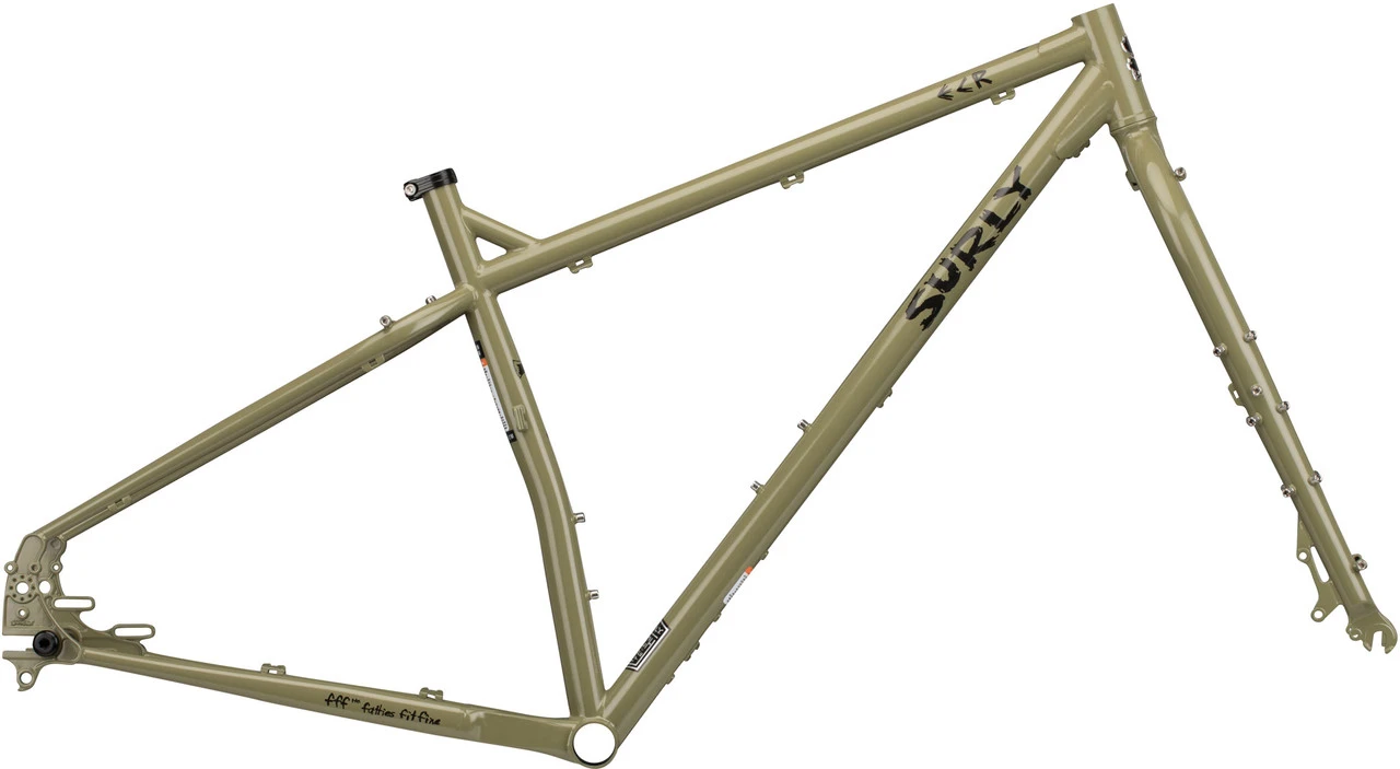 Spezifikationen:Einsatzbereich:Touring/Trekking, Cross CountryLaufradgröße:29+Rahmengrößen:M, L, XLMaterial Rahmen:Stahl (4130 CrMo)Material Gabel:Stahl (4130 CrMo)Technische Daten:Einbaubreite Hinterrad:142 mm, 148 mm (Gnot Boost)Achsstandard:12 mm SteckachseSattelstütze (Ø):27,2 mmSattelklemme (Ø):30,0 mmSteuersatz:EC34/28,6 – EC34/30Gabelschaft empf.:1 1/8″Gabeleinbauhöhe:468 mmInnenlagerstandard:BSAGehäusebreite:73 mmBremsaufnahme:Disc ISUmwerferaufnahme:Low Clamp (Schelle 28,6 mm), Direct Mount (High-Direct)Flaschenhalteraufnahmen:3Zubehöraufnahmen:Ösen für Gepäckträger und SchutzblecheTechnische Daten Gabel:Gabelschaft:1 1/8″Achssystem:Schnellspanner (9 x 100 mm)Bremsaufnahme:Disc ISVorlauf:47 mmSchaftlänge:260 mmEinbauhöhe:468 mmEinbaubreite:100 mmGabelkronendurchmesser:30 mmMaterial Gabelschaft:Stahl (4130 CrMo)Material Gabelbeine:Stahl (4130 CrMo)Zubehöraufnahmen:Ösen für GepäckträgerFreigaben:Gewichtsbeschränkung:138 kg (Fahrer und Gepäck)Scheibenbremsgröße max.:203 mm (VR), 160 mm (HR)Reifengröße max.:3,0″ (mit Schutzblechen)Kettenblattanzahl:3-fach, 2-fach, 1-fachKettenblattgröße max.:3-fach 22-34-44Z, 2-fach 26-39Z, 1-fach 34Z (Mitte), 44Z (außen)Gabeleinbaulänge max.:485 mm (Starrgabeln), 527 mm (Federgabeln)Features:WIG-geschweißt, ED-beschichtetdoppelt konifiziertes HauptdreieckSurly Trip Guide Zug-/Leitungsführungenhorizontale Ausfallenden (mit Rohloff Aufnahme)zwei normale und eine 3-Ösen-Flaschenhalteraufnahme3-fach nur möglich mit 2,5″ oder schmaleren ReifenASTM-Kategorie 3Technologie:Gnot Boost: